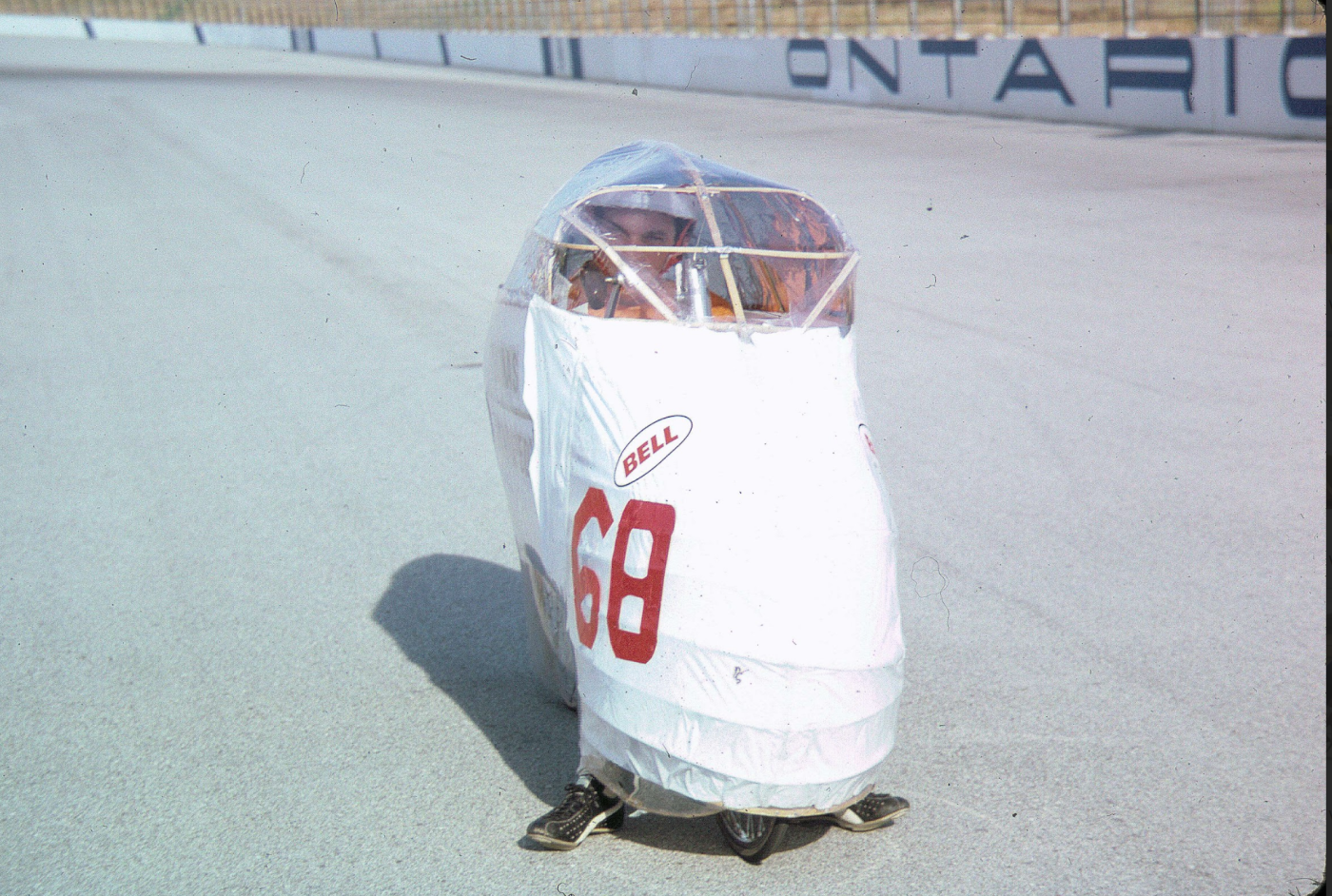 Fred and friends from Eugene travelled to Ontario, CA with their home built “Manuped” bicycles — recumbents that were pedalled with both hands and feet. And had fairings made of bamboo and vinyl.