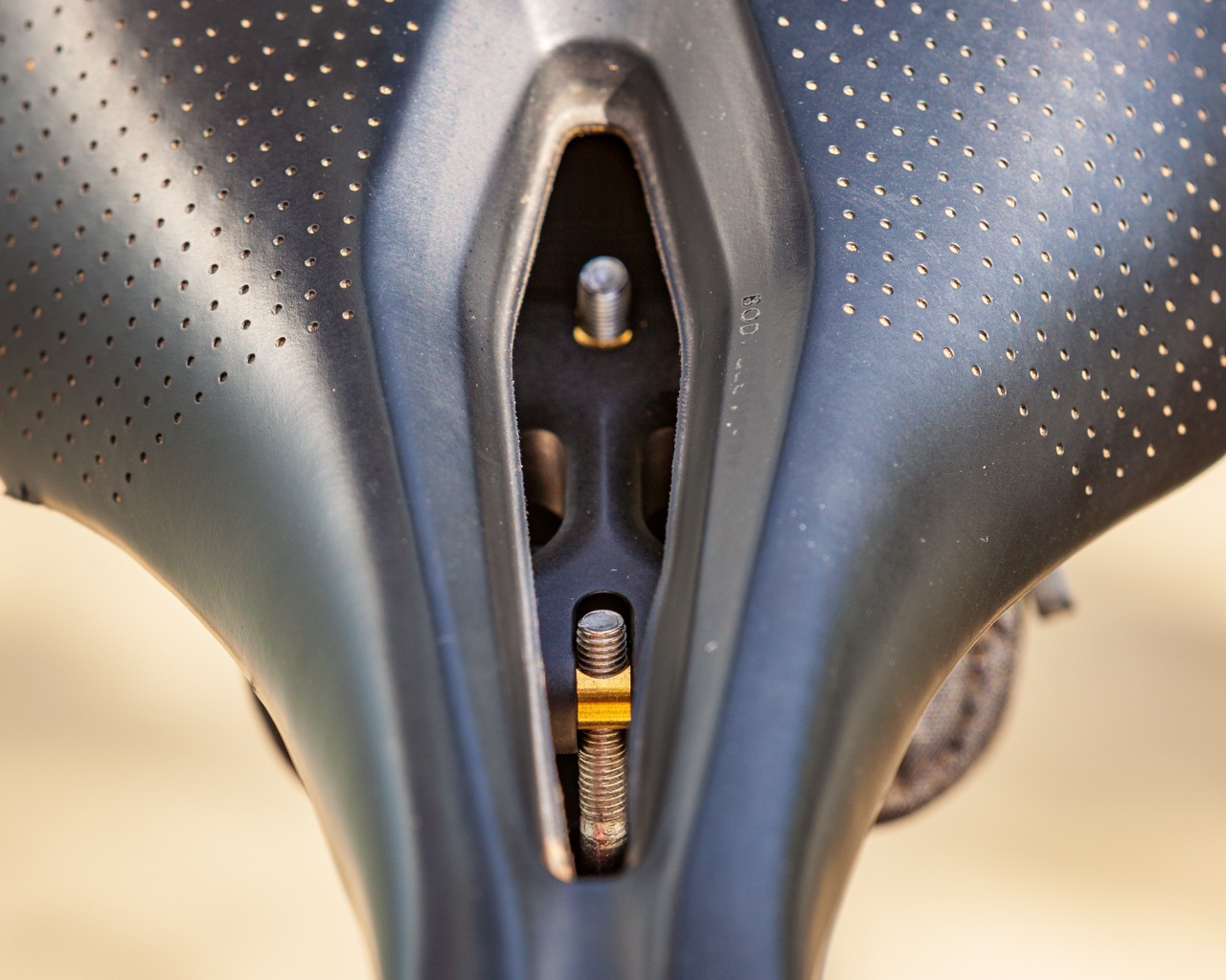 The dual-bolt system prevents saddle rail slippage, while spherical stainless steel washers allow the bolt heads to pivot and self-align to the saddle cradle. The top clamp incorporates two brass trunnions that reduce friction and prevent binding during angle changes. This makes for nice, smooth tilt adjustments.