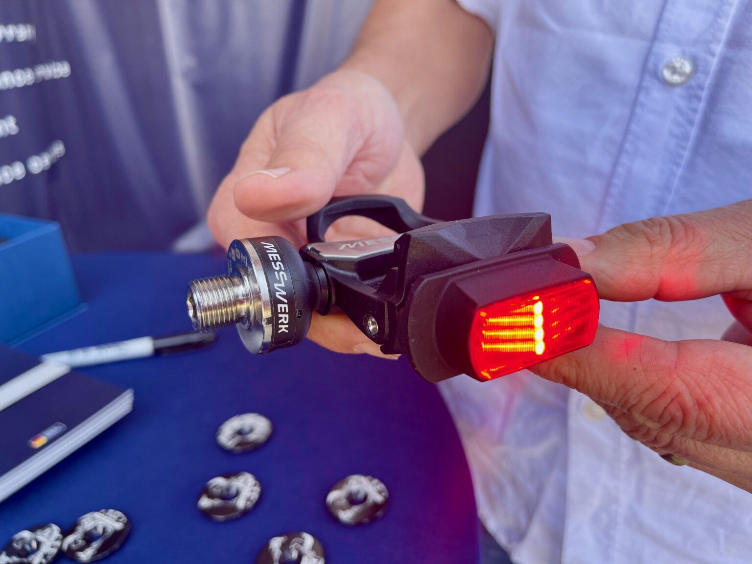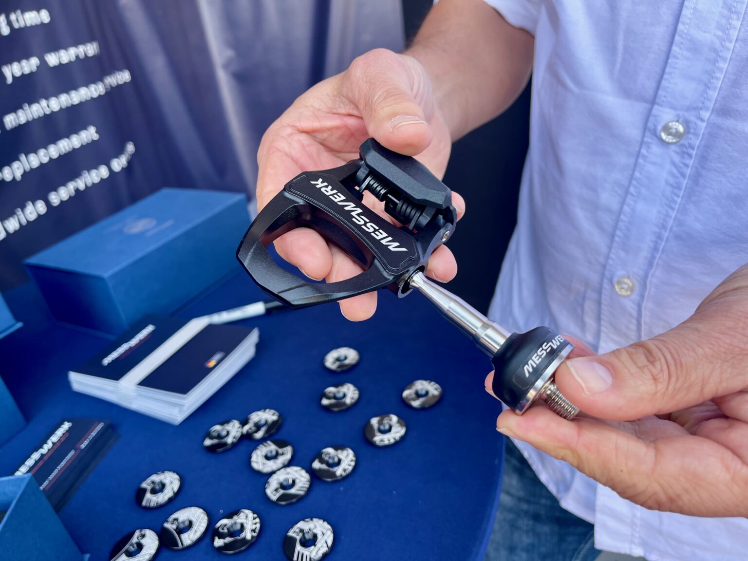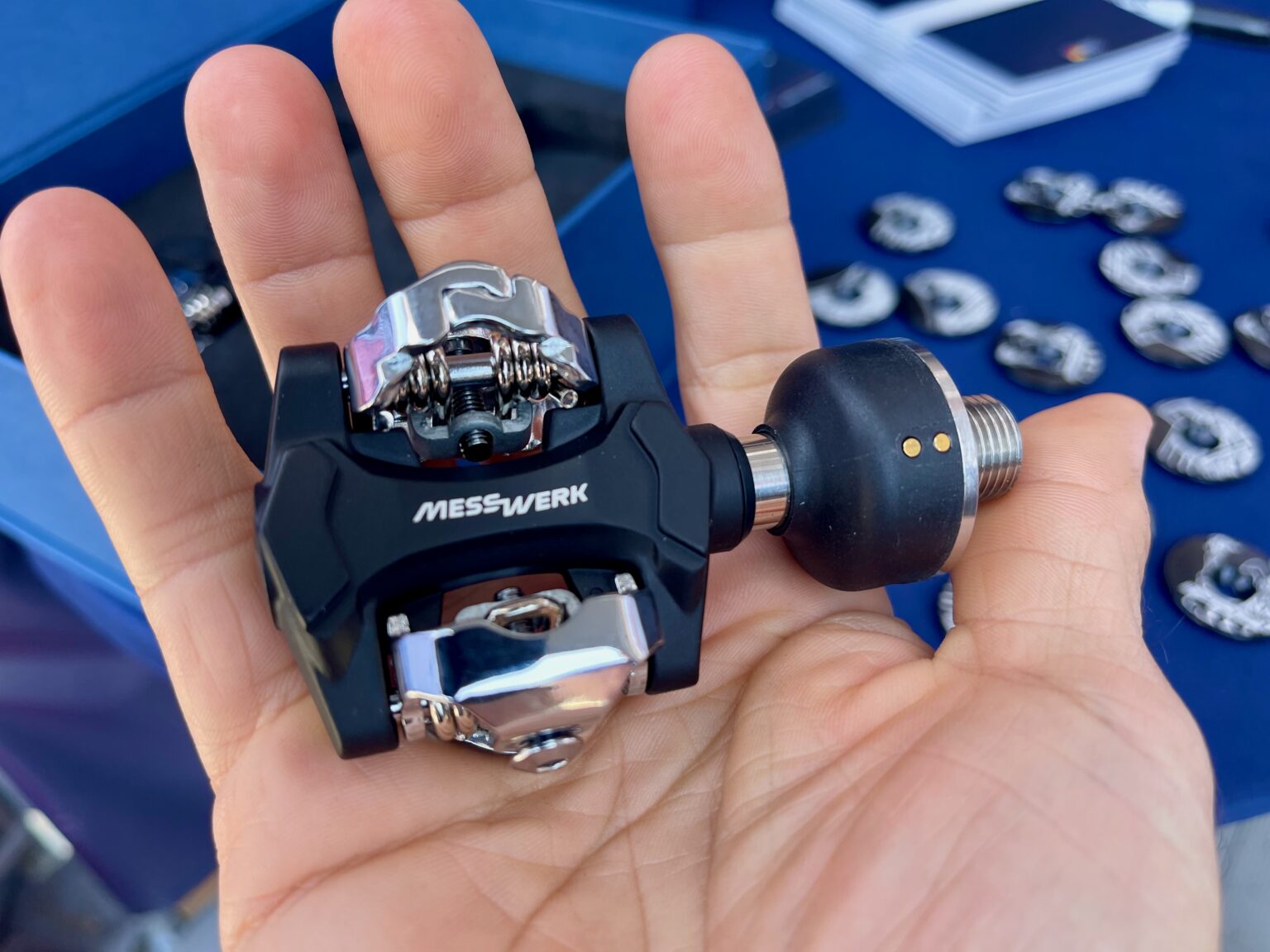 Tucked away near the FSA and Prologo booths was a very small table with a very interesting power meter pedal design. A German company named Mess Werk has a new, easily swappable pedal-body design and a compelling build story.